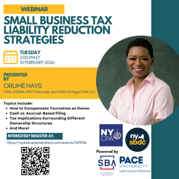Tuesday, 10 February 2026, at 2:00 PM ET. Presenter: Orumé Hays, CPA, CGMA, MST, Founder & CEO of HAYS CPA LLC Session Host: Pace SBDC NYCPA attendees of our webinar explore tax liability reduction strategies. Topics covered included best practices for owners’ compensation, understanding cash versus accrual accounting methods and additional techniques to help minimize tax burdens effectively.